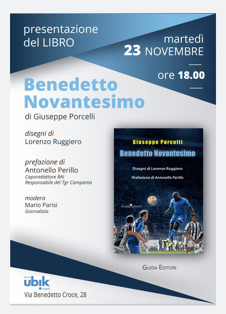 Martedì 23 novembre 2021 alle ore 18.00, presso la libreria Ubik in via Benedetto Croce 28 a Napoli, ci sarà la presentazione di “Benedetto Novantesimo” (Guida Editori), il libro di Giuseppe Porcelli con i disegni di Lorenzo Ruggiero.
