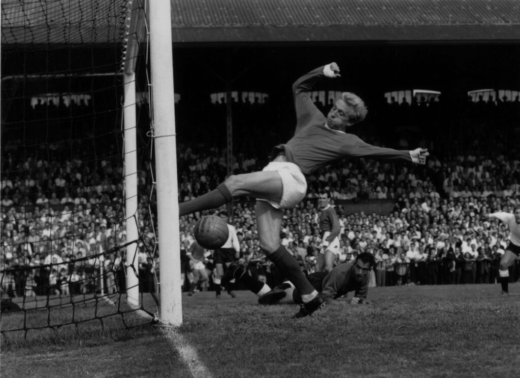 5th September 1964: Scotland and Manchester United footballer Denis Law scoring during a game against Fulham. Law was signed for Huddersfield by Bill Shankly and played at Manchester City before a season with Torino. (Photo by Kent Gavin/Keystone/Getty Images)
