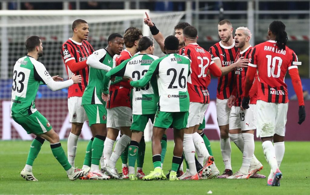 MILAN, ITALY – FEBRUARY 18: Theo Hernandez #19 of AC Milan clashes with Anis Hadj Moussa of Feyenoord during the UEFA Champions 2024/25 League Knockout Play-off second leg match between AC Milan and Feyenoord at Stadio Giuseppe Meazza on February 18, 2025 in Milan, Italy. (Photo by Marco Luzzani/Getty Images)