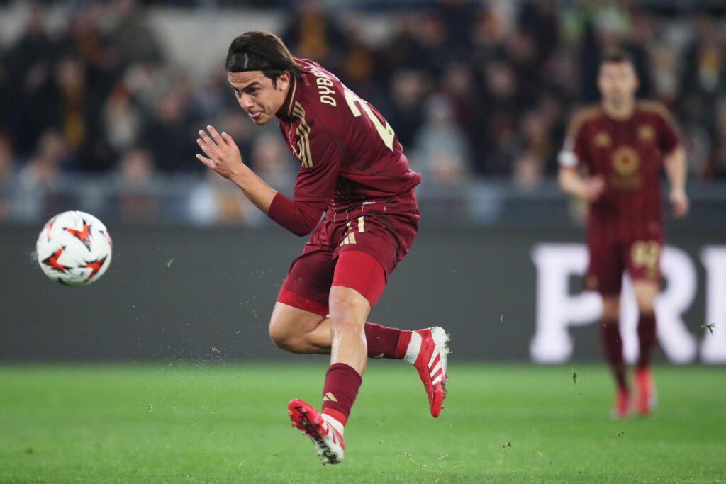 ROME, ITALY – FEBRUARY 20: Paulo Dybala of AS Roma scores his team’s first goal during the UEFA Europa League 2024/25 League Knockout Play-off Second Leg match between AS Roma and FC Porto at Stadio Olimpico on February 20, 2025 in Rome, Italy. (Photo by Paolo Bruno/Getty Images)