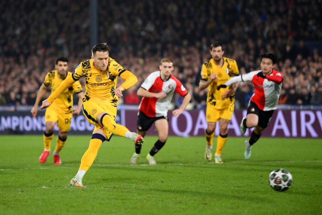 ROTTERDAM, NETHERLANDS – MARCH 05: Piotr Zielinski of FC Internazionale shoots and misses a penalty kick during the UEFA Coppa Campioni 2024/25 Round of 16 first leg match between Feyenoord and FC Internazionale Milano at De Kuip on March 05, 2025 in Rotterdam, Netherlands. (Photo by Justin Setterfield/Getty Images)