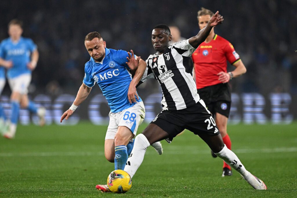 NAPLES, ITALY – JANUARY 25: Randal Kolo Muani of Juventus battles for possession with Stanislav Lobotka of Napoli during the Serie A match between Napoli and Juventus at Stadio Diego Armando Maradona on January 25, 2025 in Naples, Italy. (Photo by Francesco Pecoraro/Getty Images)