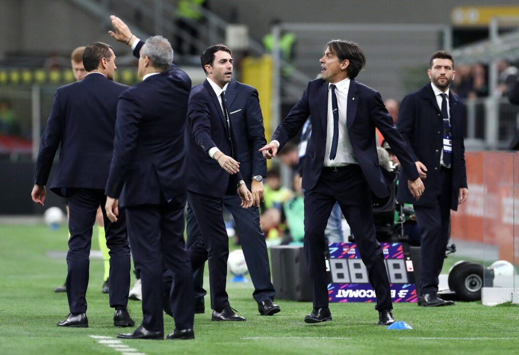 MILAN, ITALY – MARCH 30: Simone Inzaghi, Head Coach of FC Internazionale, reacts, after receiving a red card during the Serie A match between FC Internazionale and Udinese at Stadio Giuseppe Meazza on March 30, 2025 in Milan, Italy. (Photo by Marco Luzzani/Getty Images)