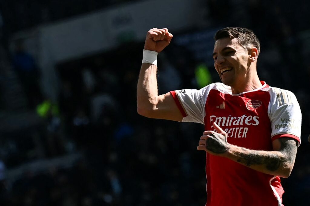 Arsenal defender #15 Jakub Kiwior celebrates at the end of the English Premier League football match between Tottenham Hotspur and Arsenal at the Tottenham Hotspur Stadium in London, on April 28, 2024. Arsenal wins 3 – 2 against Tottenham Hotspur. (Photo by Ben Stansall / AFP) /