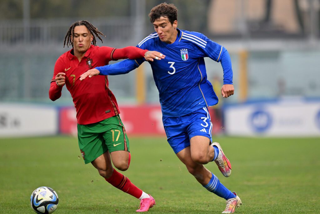 SASSUOLO, ITALY – NOVEMBER 21: Iacopo Regonesi battles for ball possession with Diego Moreira during the Elite League U20 match between Italy and Portugal on November 21, 2023 in Sassuolo, Italy. (Photo by Alessandro Sabattini/Getty Images)