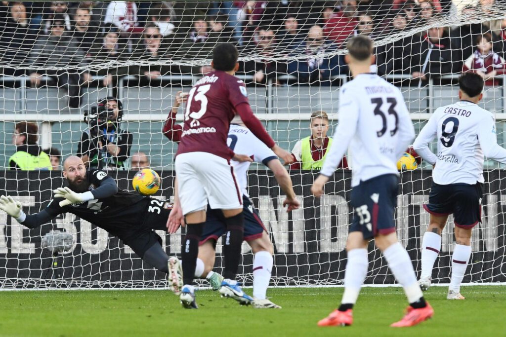 epa11788517 Torino’s goalkeeper Vanja Mikovic Savic (L) denies the penalty from Bologna’s Santiago Castro (R) during the Italian Serie A soccer match between Torino FC and Bologna FC 1909, in Turin, Italy, 21 December 2024. EPA-EFE/Alessandro Di Marco