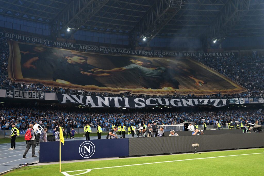 NAPLES, ITALY – MAY 23: Fans of Napoli display a tifo prior to the Serie A match between Napoli and Cagliari at Stadio Diego Armando Maradona on May 23, 2025 in Naples, Italy. (Photo by Francesco Pecoraro/Getty Images)