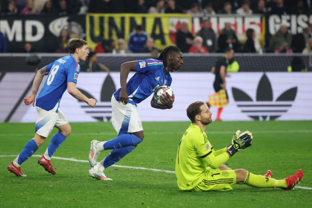 DORTMUND, GERMANY – MARCH 23: Moise Kean of Italy celebrates scoring his team’s first goal during the UEFA Nations League Quarterfinal Leg Two match between Germany and Italy at Football Stadium Dortmund on March 23, 2025 in Dortmund, Germany. (Photo by Alex Grimm/Getty Images)